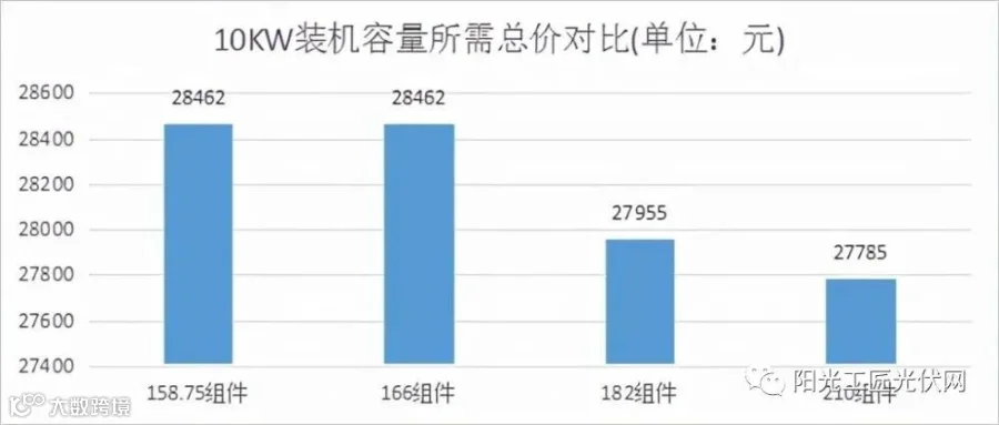 根据图1-16所示,以10千瓦装机容量为例,使用更大尺寸硅片的组件可以节省一定的成本。