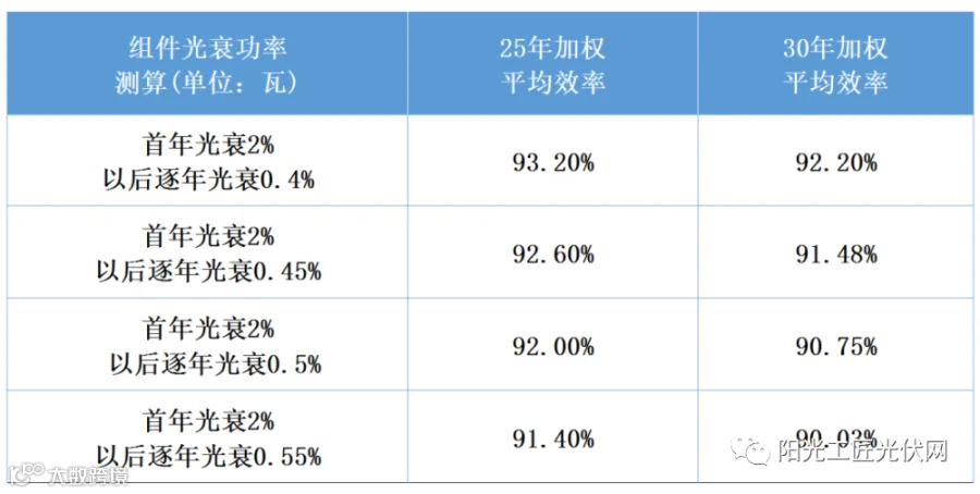 将光伏组件全生命周期光衰进行加权平均,按照使用寿命25年和30年分别计算可以得出光伏组件在生命周期内的平均发电效率,有了这个平均发电效率才能更便捷地估算光伏组件的总发电量,也才好估算总收入和利润。为了保守起见我们还是采用首年光衰2%,以后逐年光衰0.55%来进行测算。