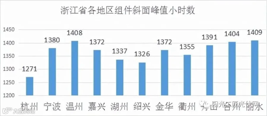 从图1-8所示,可以看出浙江省太阳能资源最差的是杭州市,斜面峰值日照时数只有1271小时。最好的是丽水市斜面峰值日照时数有1409个小时。这里和上面图1-3 统计的分月日照信息有一定的差异,这是因为前面并没有考虑空气的质量问题。