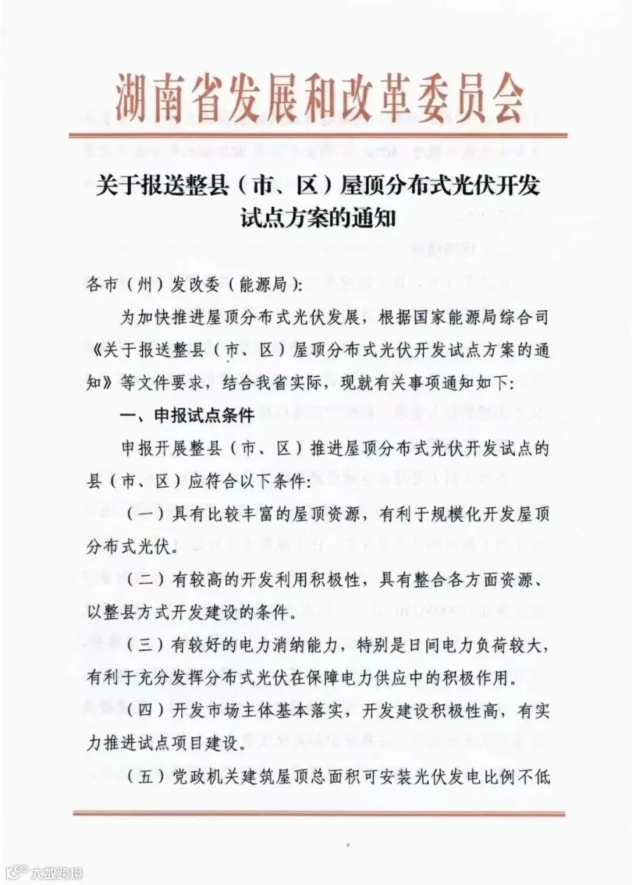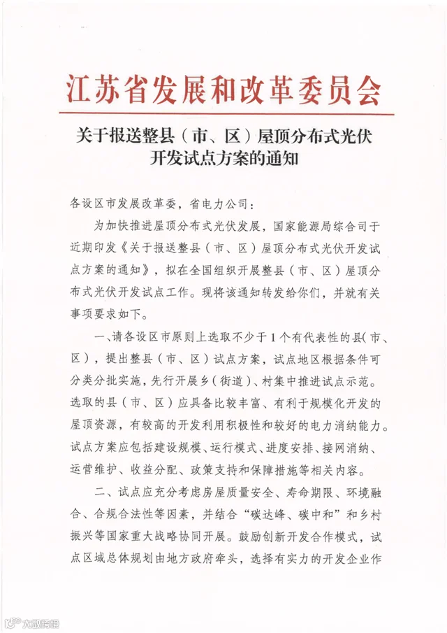 现将《国家能源局综合司关于报送整县(市、区)屋顶分布式光伏开发试点方案的通知》(以下简称《通知》)转发给你们,请你们认真学习领会,结合城镇化建设水平和乡村振兴战略,按照自愿原则,组织申报整县(市)屋顶分布式光伏开发试点方案。