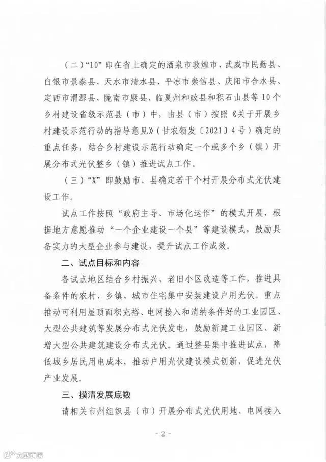 “10”即在省上确定的酒泉市敦煌市、武威市民勤县、白银市景泰县、天水市清水县、平凉市崇信县、庆阳市合水县、定西市渭源县、陇南市康县、临夏州和政县和积石山县等10个乡村建设省级示范县(市)中,由县(市)按照《关于开展乡村建设示范行动的指导意见》(甘农领发〔2021〕4号)确定的重点任务,结合乡村建设示范行动确定一个或多个乡(镇)开展分布式光伏整乡(镇)推进试点工作。