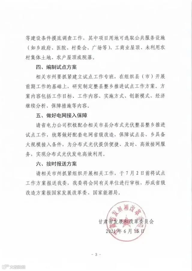“3”即由张掖市、金昌市、定西市确定一个县(区)开展分布式光伏整县推进试点工作。