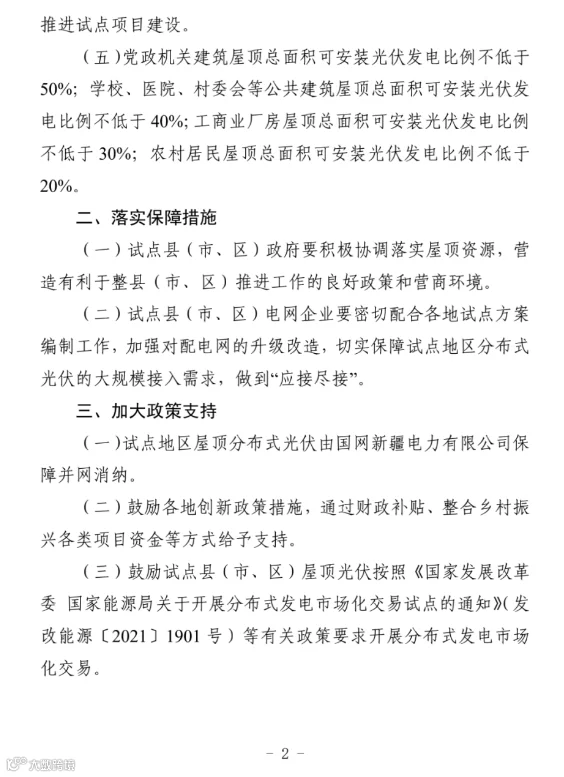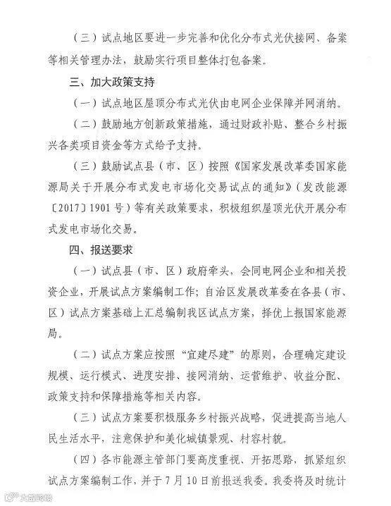 试点地区屋顶分布式光伏由国网新疆电力有限公司保障并网消纳,鼓励各地创新政策措施通过财政补贴整合乡村振兴各类项目资金等方式给予支持