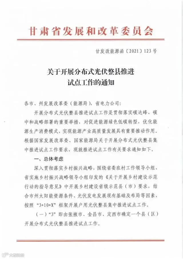甘肃省政策:按“3+10+X”框架开展户用光伏整县集中推进试点工作