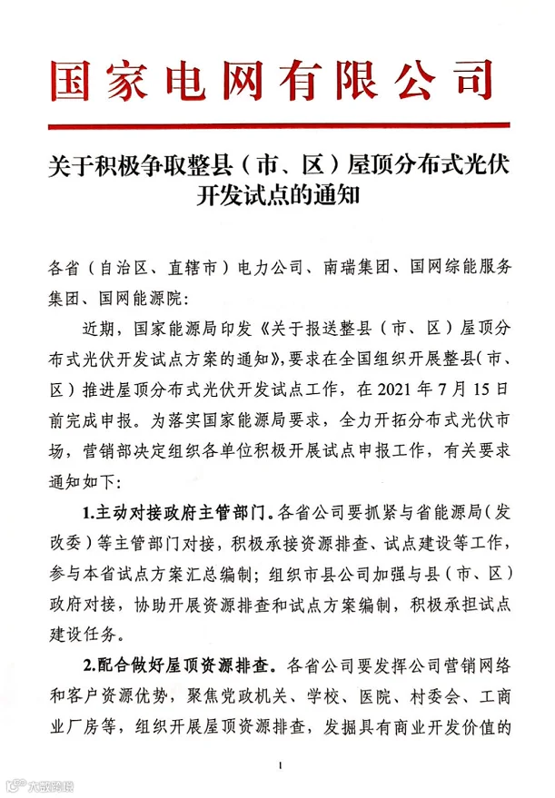 近日,国家电网有限公司向各省级公司下发了《关于积极争取整县(市、区)屋顶分布式光伏开发试点》的通知。