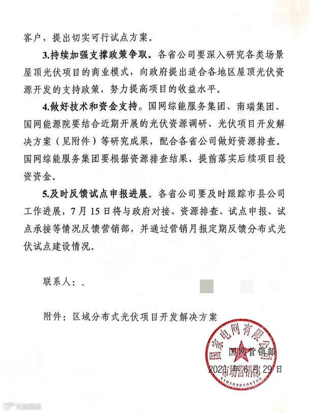 此外,各省公司要及时跟踪市县公司工作进展,7月15日将与政府对接、资源排查、试点申报、试点承接等情况反馈营销部,并通过营销月报定期反馈分布式光伏试点建设情况。