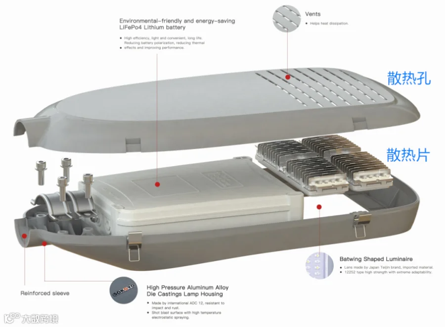 易达太阳能路灯采用导热性极佳的散热片,内腔空间大,热交换面积大,带走更多热量。