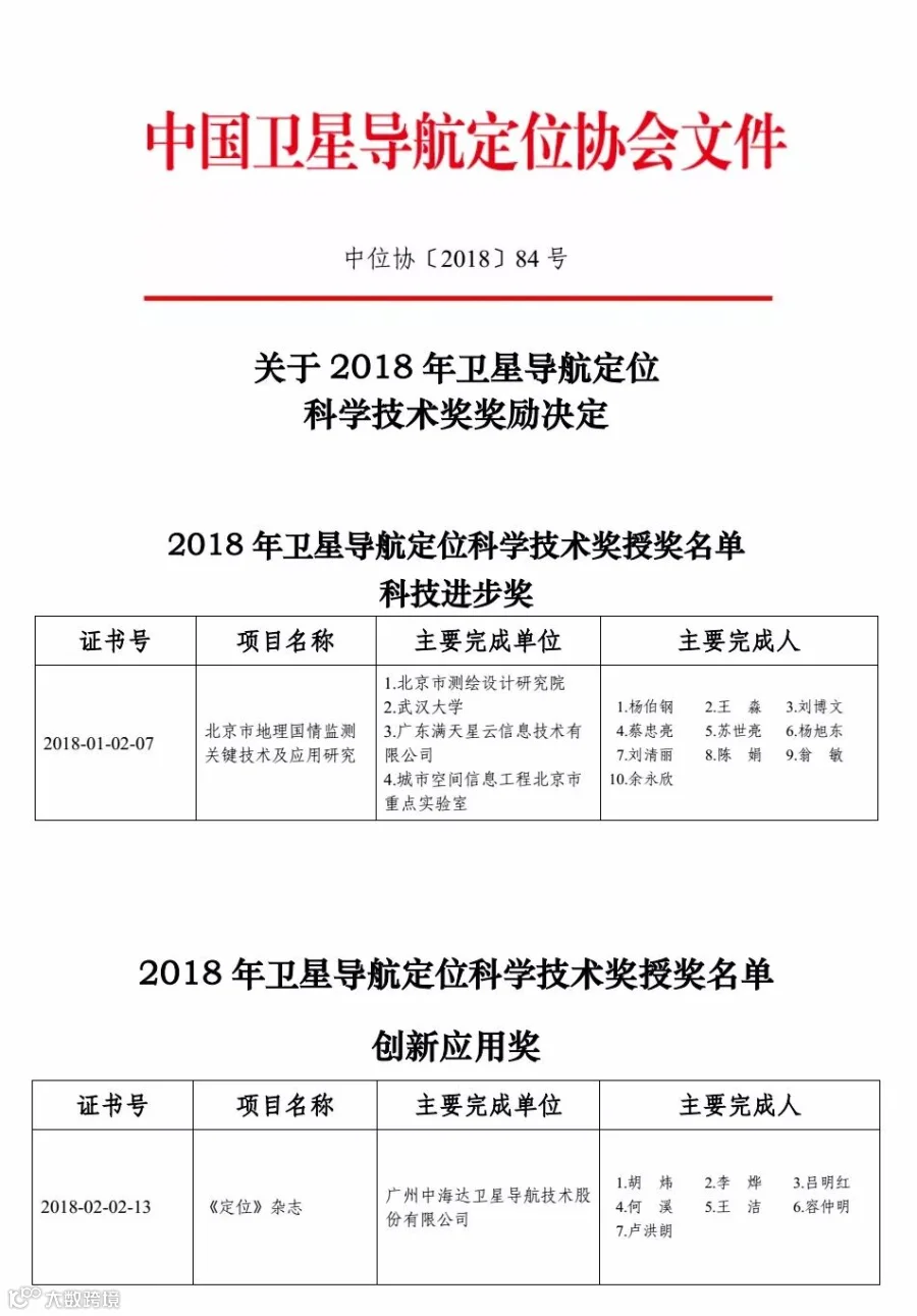 近日,2018年卫星导航定位科学技术奖奖励公布,中海达旗下子公司广东满天星云信息技术有限公司参与完成的“北京市地理国情监测关键技术及应用研究”项目获科技进步奖,广州中海达卫星导航技术股份有限公司创办的《定位》杂志获创新应用奖。