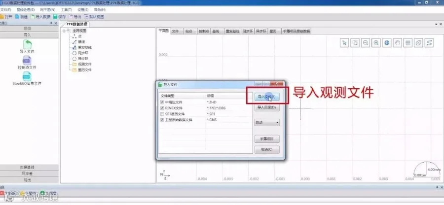 动态GPS数据处理一般包括两种数据:基准站静态数据和移动站动态数据,操作方法:打开HGO软件,新建项目文件,导入观测文件及手簿项目,软件可自动显示外业采集的RTK点。