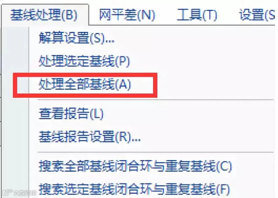 点击菜单栏【基线处理】,弹出基线处理菜单,选择【处理全部基线】,后台将逐条处理全部基线并出现对话框,列明各条解算基线的名称、进度以及解算信息。