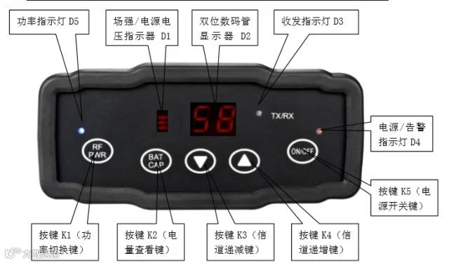 红灯点亮表示本机无线电正在发射数据,蓝灯点亮表示本机正在接受无线电数据。
