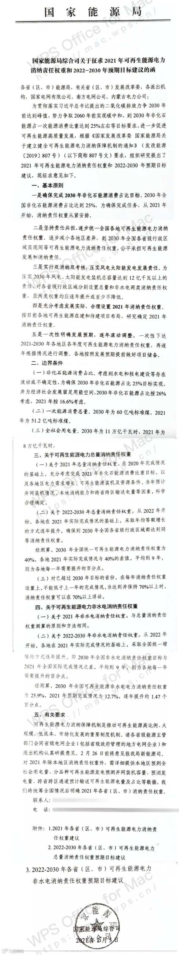 2月5日,为确保完成2030年非化石能源占一次能源消费比重达25%左右等目标要求,进一步促进可再生能源高质量发展,根据《国家发展改革委国家能源局关于建立健全可再生能源电力消纳保障机制的通知》(发改能源〔2019〕807 号)(以下简称 807 号文)要求,国家能源局对2021年可再生能源消纳责任权重目标和2022-2030年预期目标作出建议征集。