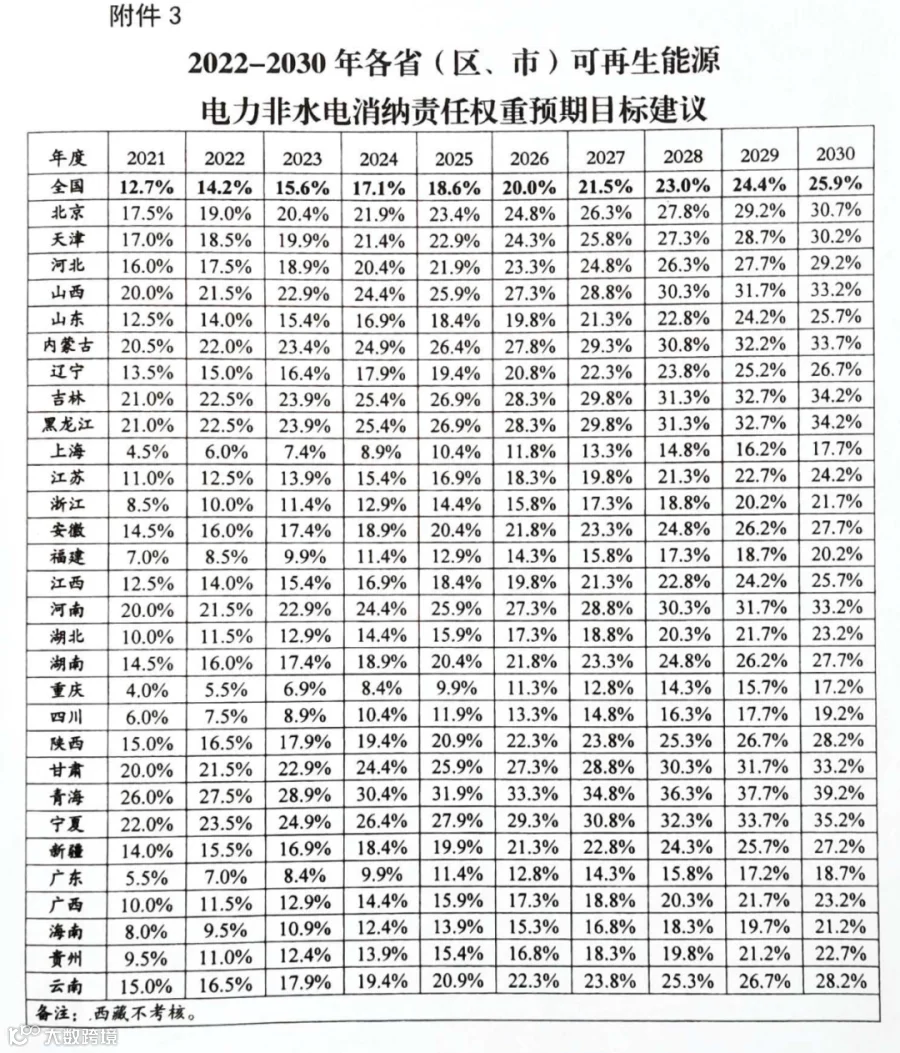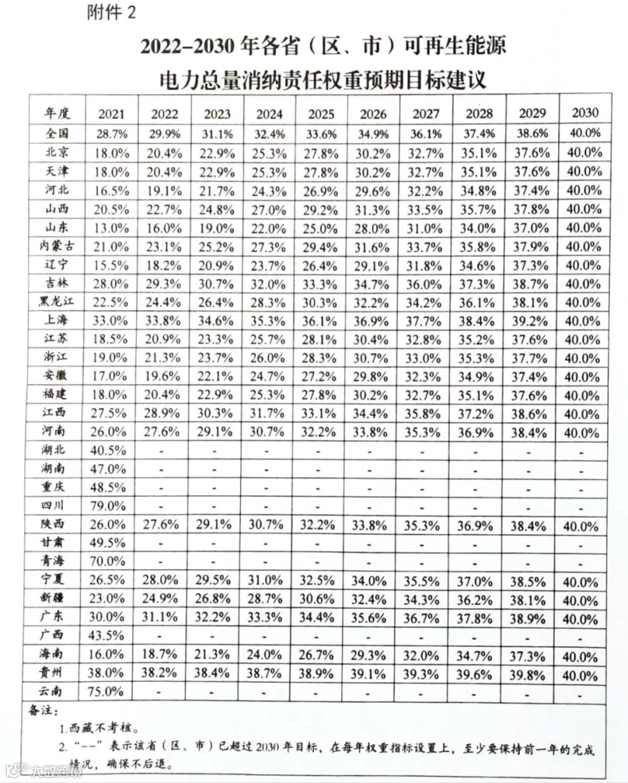(二)关于 2022-2030 年总量消纳责任权重。从 2022 年开 始,各地在 2021年实际完成情况的基础上,采取年均等额增长的方式逐年提升,确保到 2030 年全国各省级行政区域都达到同等消纳责任权重。