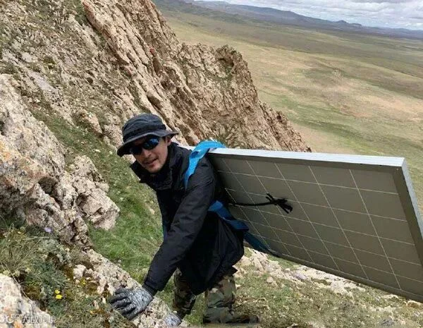 (胡歌背着光伏板上山)