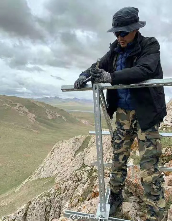 照片里的胡歌,背着光伏板正在往山上走,然后自己动手在山顶安装光伏支架,姿势有模有样。