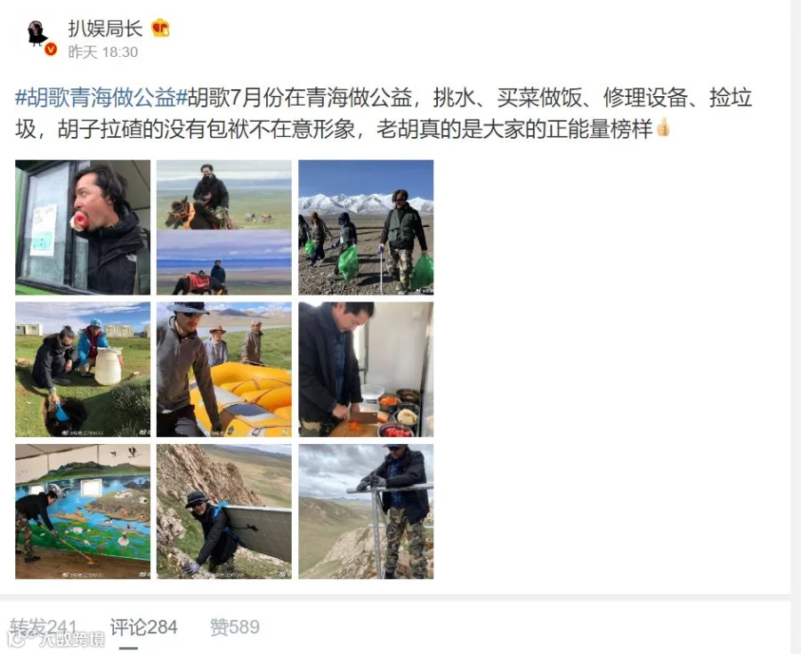 2019年7月25日,微博上有网友爆料:胡歌出现在青海某地做公益,在那里他像一个普通人一样挑水、买菜做饭、修理设备、捡垃圾。