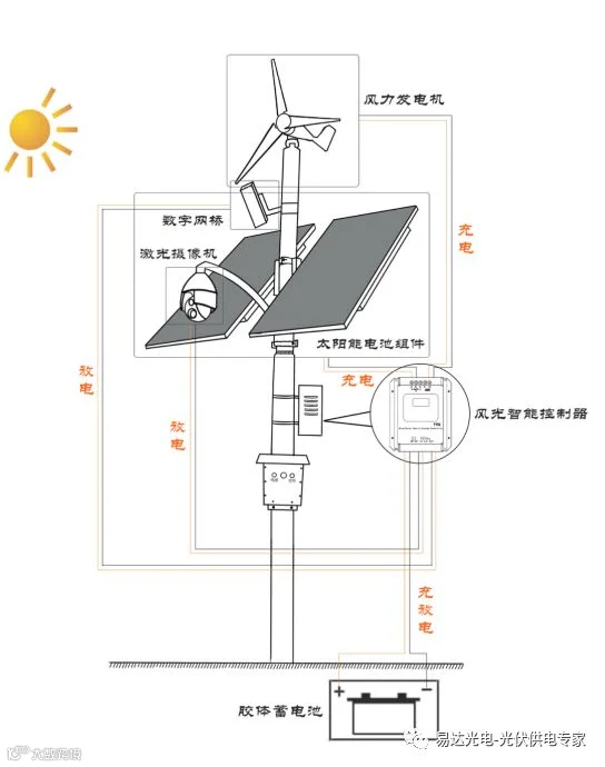 根据本项目的要求,使用1套太阳能风能互补供电系统。太阳能供电选用杭州易达光电有限公司的型号为YDM系列太阳能供电产品,配置太阳能光伏板、800W风机,8节12V/100AH蓄电池。
