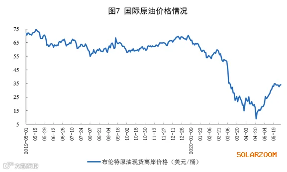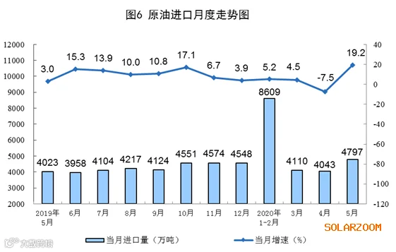 原油进口由降转增,国际原油价格快速回升。5月份,进口原油4797万吨,同比增长19.2%,上月为下降7.5%。1—5月份,进口原油21558万吨,同比增长5.2%。5月29日布伦特原油现货离岸价格为34.15美元/桶,比4月30日的18.11美元/桶回升88.6%。