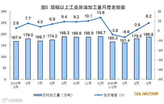 原油生产有所加快,加工量较快增长。5月份,生产原油1646万吨,同比增长1.3%,增速比上月加快0.4个百分点;加工原油5790万吨,增长8.2%,比上月加快7.4个百分点。1—5月份,生产原油8090万吨,同比增长1.9%;加工原油26139万吨,下降1.0%。