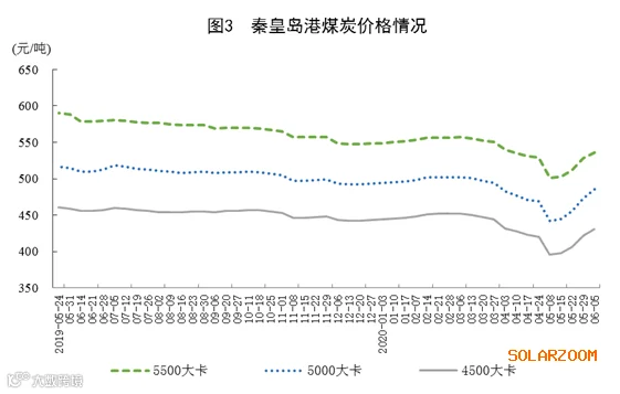 煤炭进口大幅下降,港口交易价格止跌回升。5月份,进口煤炭2206万吨,环比减少889万吨,同比下降19.7%;1—5月份,进口煤炭1.49亿吨,同比增长16.8%。港口煤炭综合交易价格止跌回升,6月5日秦皇岛港5500、5000和4500大卡煤炭价格分别为每吨536元、485元和431元,比5月8日的年内最低点分别回升35元、43元和35元。