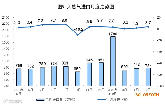 天然气进口稳定增长。5月份,进口天然气784万吨,同比增长3.7%。1—5月份,进口天然气4012万吨,同比增长1.9%。