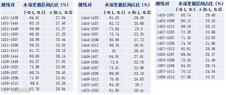 另外,从测量绝对误差进行统计,按照《水运工程测量规范》要求:当水深小于20m,误差不超过20cm;当水深超过20m时,误差不超过0.01h(h为水深),依此统计水深差值范围: