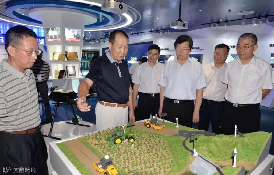 廖定海董事长(左二)向吴清海副局长(右三)一行介绍北斗农机产品