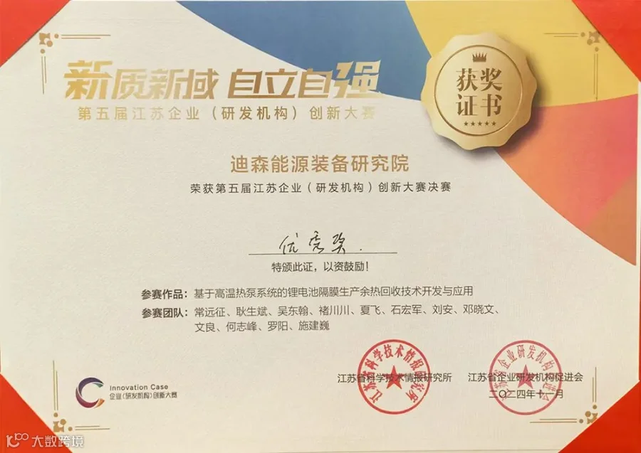 经过激烈比拼,迪森能源装备研究院参赛作品“传承古法经典 智酿创新未来——迪森智能蒸酒器研制项目”荣获第五届江苏企业(研发机构)创新大赛选拔赛三等奖,参赛作品“‘泵’发动力,助‘锂’未来——基于高温热泵系统的锂电池隔膜生产余热回收技术开发与应用”荣获第五届江苏企业(研发机构)创新大赛决赛优秀奖。