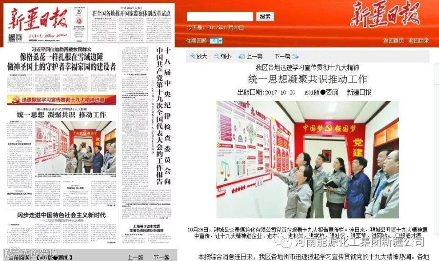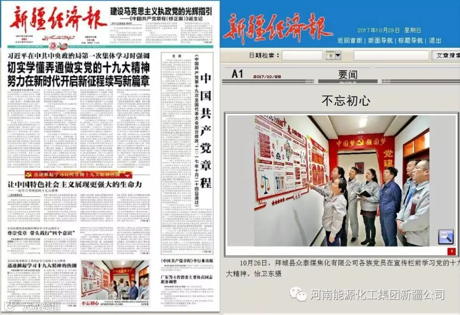 10月30日,新疆日报、新疆经济报、新疆法制报均在头版醒目位置刊登新疆公司众泰煤焦化学习宣贯十九大精神相关报道。同时,相关报道被人民网转载。