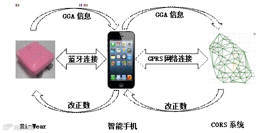 Hi-Wear通过蓝牙与智能设备连接,并向智能设备发送GGA信息。而智能设备(如智能手机等)可以安装一个中海达开发的APP,通过GPRS网络连接提供差分服务的CORS服务器或者单基站服务器,并把GGA信息转发给服务器。服务器根据GGA信息,生成改正数发送给智能设备,而智能设备再将改正数转发给Hi-Wear,Hi-Wear的内置RTK算法进行亚米级定位解算,最终的亚米级定位坐标显示在智能设备APP的地图上。