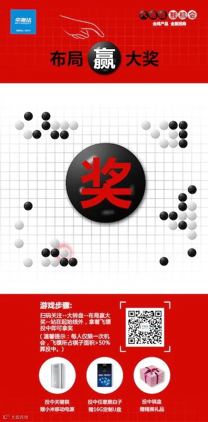 到“布局赢大奖”游戏专区,站在起始线外,拿着飞镖投中棋子即可拿奖。