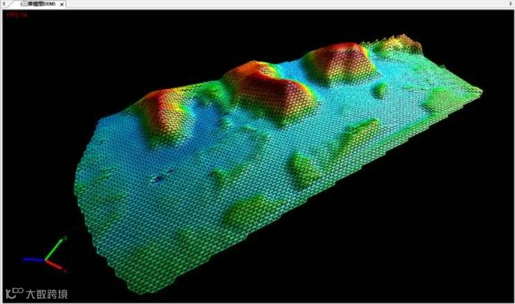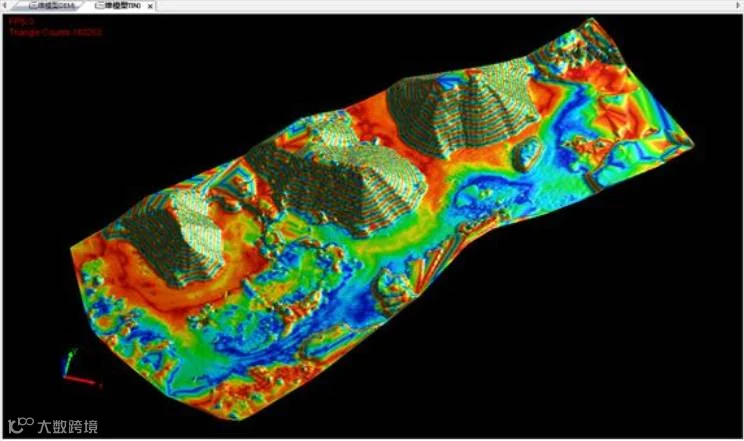 利用HD 3LS SCENE软件将点云进行精细分类后,可单独对地表数据进行优化处理,软件采用先进算法,利用多种内插方式对缺损区域进行补充,然后通过点云进行快速建立三角网,能用更少的空间和时间更精确地表示更加复杂的表面,精细的反映出地形中含有大量的特征,如断裂线、构造线、沟坎等。