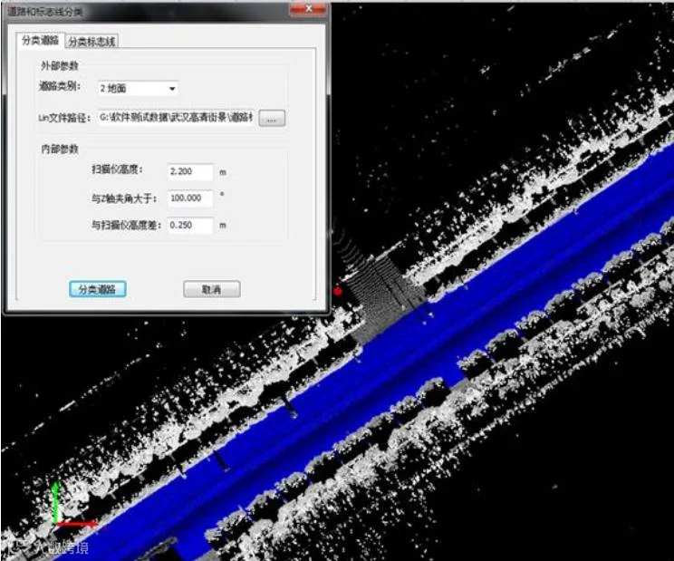 在地物要素提取时,可设置详细参数,自动提取建筑立面、行道书、垃圾桶、立杆、道路、道路标识线等要素,快速建立道路分类信息数据。