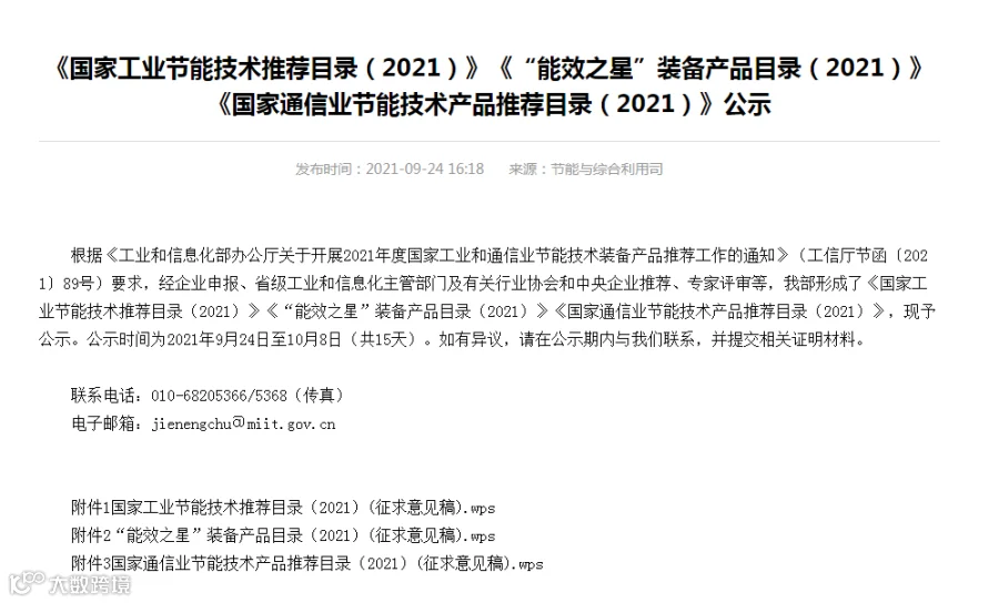 中华人民共和国工业和信息化部发布《“能效之星”装备产品目录(2021)》公示发布