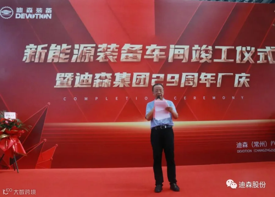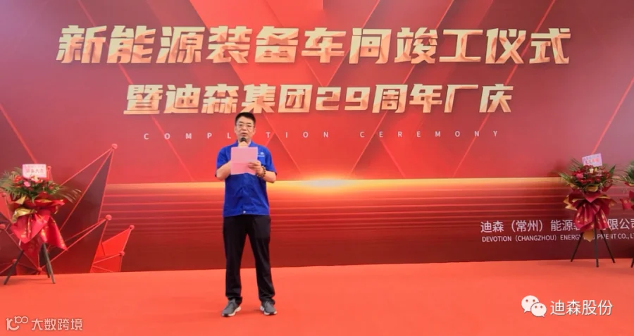 在迪森(常州)能源装备有限公司会场,集团董事长常厚春出席并致辞,阐述了集团战略转型的方向,装备公司重新布局,新能源厂房正式启用,宣告迪森装备进入新能源的主赛道,并感谢了迪森人,感谢了所有的客户、股东和投资人,感谢对迪森的大力支持,未来在新的赛道我们再启征程。