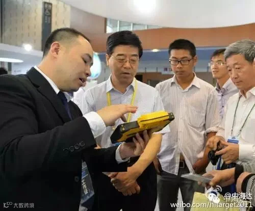 中海达集团研发总监王受芬(左一)为国家测绘地理信息局副局长李维森(左二)讲解中海达北斗新品Qpad