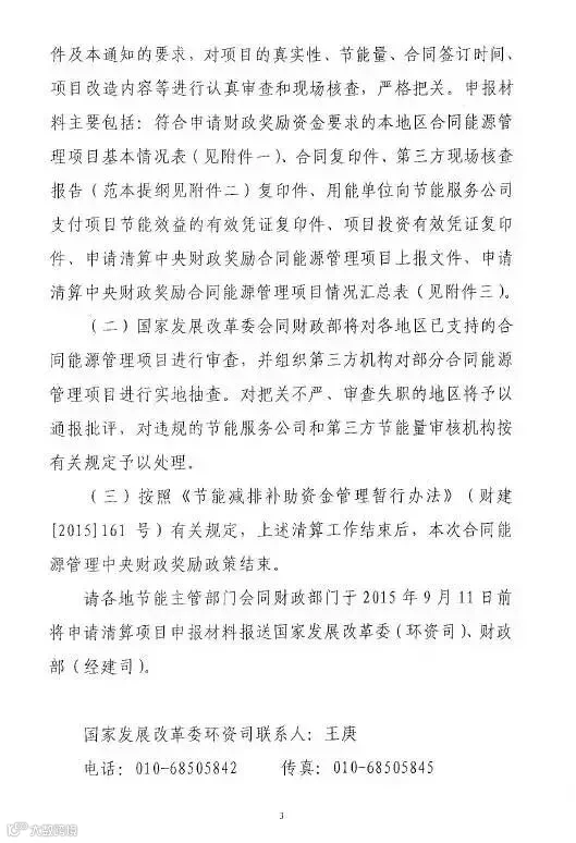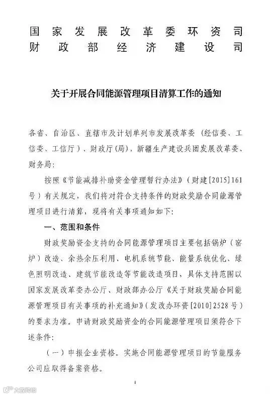 7月27日,国家发改委、财政部联合向各省、自治区、直辖市、新疆生产建设兵团等下发《关于开展合同能源管理项目清算工作的通知》文件。通知要求:按照《节能减排补助资金管理暂行办法》(财建【2015】161号)的规定,对符合支持条件的财政奖励合同能源管理项目进行清算。财政奖励资金支持的合同能源管理项目主要包括锅炉(窑炉)改造、余热余压利用、惦记系统节能、能量系统优化、绿色照明改造、建筑节能改造等节能改造项目、具体支持范围以国家发改委办公厅、财政部办公厅《关于财政部奖励合同能源管理项目有关事项的补充通知》(发改办环资【2010】2525号)要求为准。