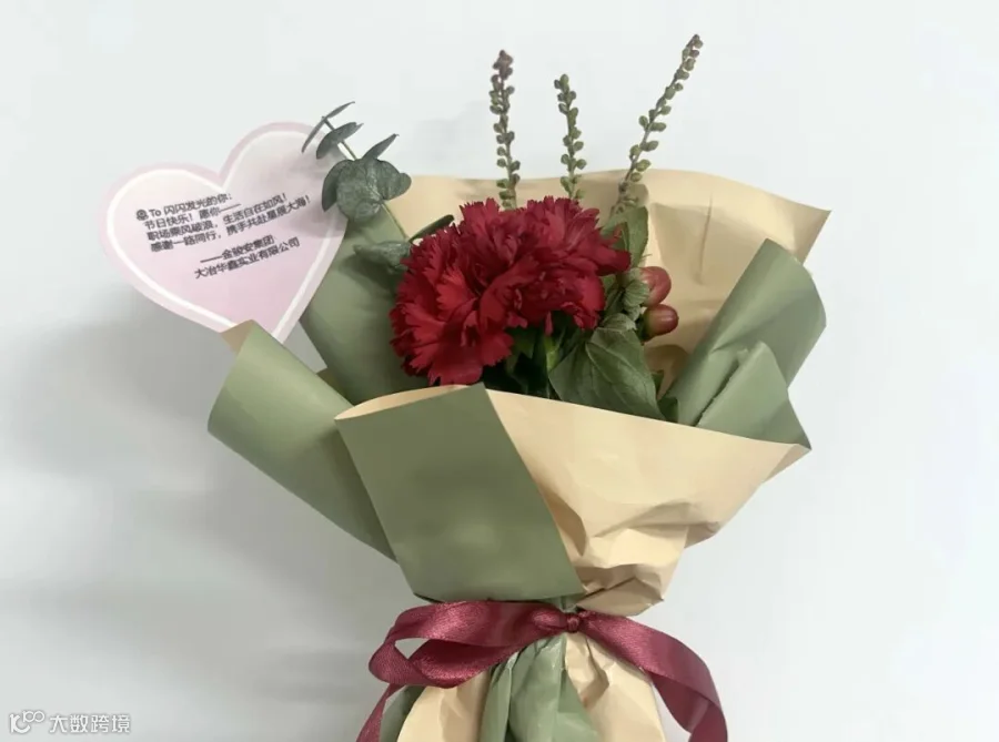 康乃馨花束内附有暖心贺卡,贺卡内容表达了公司对女职工在岗位上辛勤劳动的感谢,以及对女性同仁们生活、工作上的美好祝愿。领取花束后,手捧鲜花围绕在一起的女员工纷纷表示:“鲜花和贺卡承载着公司的心意,让我们感受到被重视的温暖”。