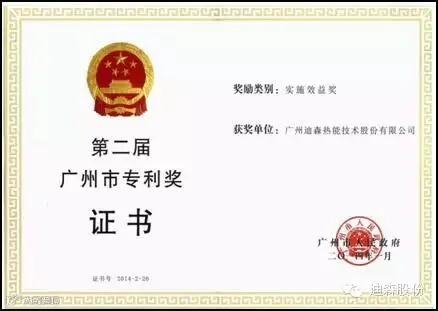 2015年6月2日,广州市科技创新大会在广州市政府隆重召开,会上通报了2013年、2014年广州市科学技术奖和第二届广州市专利奖获奖名单,迪森股份凭借其在生物质能源应用方面专利技术的有效实施,创造出良好的经济效益,荣获第二届广州市专利实施效益奖。