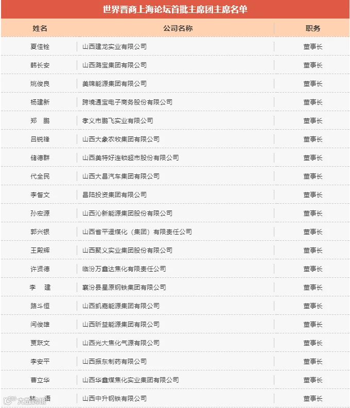 会议原则通过“首届世界晋商上海论坛实施方案”,同意组委会秘书处聘请以下40位百强企业董事长(详见附录名单)为论坛主席团主席,聘请山西省民营经济促进会顾问、原赛格集团董事长、富士康董事长郭台铭特别助理孙玉麟教授为总设计师,聘请上海市山西商会副会长、天之勤文化传媒有限公司董事长彭菲为总策划,聘请山西省总商会副会长、山西省民营经济促进会执行会长、中德集团董事长程田青为总指挥,具体负责论坛的组织实施工作。