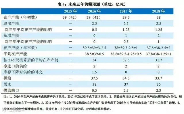 假设产能退出集中于未来三年,每年约2.5亿吨,新增产能主要在2017~2018年释放,叠加“276个工作日”政策的影响后,2016~2018年的供给分别约为37.5亿吨(考虑了库存对供给的补充)、34.5亿吨和33.7亿吨,小于三年分别约为38亿吨、37亿吨和36亿吨的需求,供给缺口分别约为0.5亿吨、2.5亿吨和2.3亿吨。考虑到供给不足将导致煤价上升,进而导致煤炭进口量增长以补充部分供给,最终供给缺口或小于以上数值。
