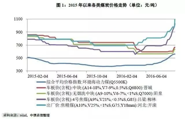 根据上文的分析,系列去产能政策的严格执行会使供给不足,煤价上升,这与煤价的实际表现相吻合。从2016年5月份开始,煤炭价格步入上升通道,除无烟中块、小块等化工用煤外,炼焦煤、动力煤均涨幅明显,截至2016年9月末,环渤海动力煤、山西河北地区炼焦煤分别升至约560元/吨和1000元/吨(含税),约为2014年一季度的水平。