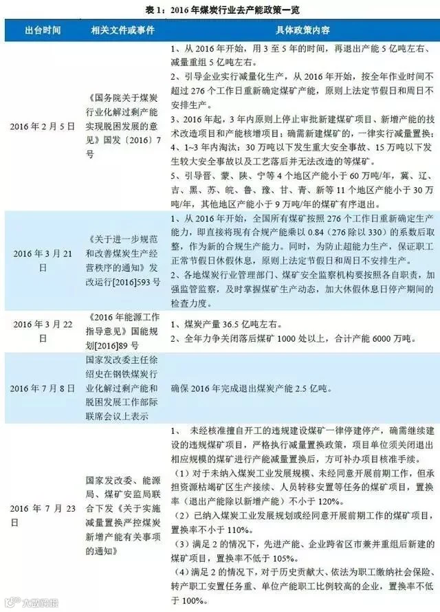 在《意见》发布后,2016年3月21日,发改委发布《关于进一步规范和改善煤炭生产经营秩序的通知》,进一步明确“276个工作日”限产政策,并要求各地煤炭行业相关管理机构加强监察,加大休假休息日停产期间的检查力度,确保“276个工作日”政策的落实。次日,国家能源局发布《2016年能源工作指导意见》,要求2016年全年力争关闭落后煤矿1000处以上,合计产能约6000万吨。同年7月8日,在钢铁煤炭行业化解过剩产能和脱困发展工作部际联席会议上,国家发改委主任徐绍史表示要确保2016年完成退出煤炭产能2.5亿吨。
