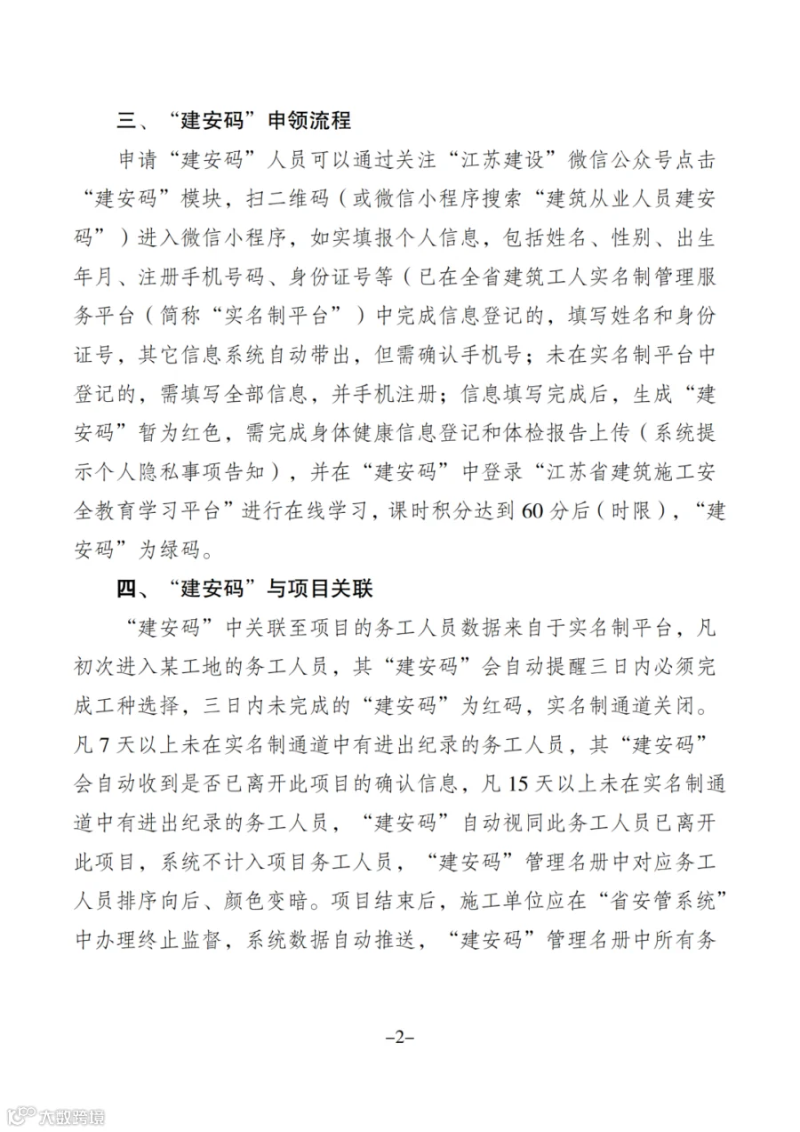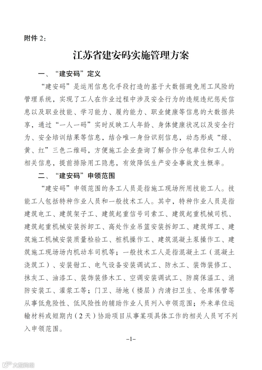 今年5月,江苏省住建厅发布《关于进一步做好建筑施工从业人员“建安码”系统试点应用的通知》,先行在盐城市本级、扬州市邗江区、镇江市句容市三个区域内所有在建项目中试点。