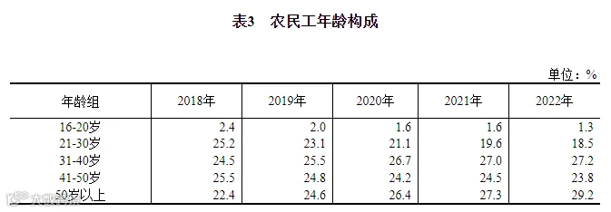 农民工平均年龄42.3岁,比上年提高0.6岁。从年龄结构看,50岁以上农民工所占比重为29.2%,比上年提高1.9个百分点。