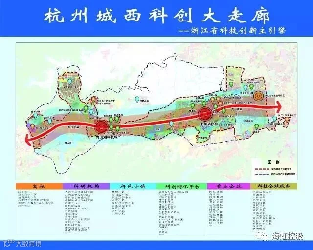 先说说科创走廊。根据杭州西湖区刚刚公布的发展规划,紫金港科技城2018年开建。到2020年,一座产业高度集聚的现代化新城,将在杭州城西崛起。紫金港科技城也将与未来科技城、青山湖科技城一并构成杭州城西科创大走廊,即所谓形成“一廊三城”格局。