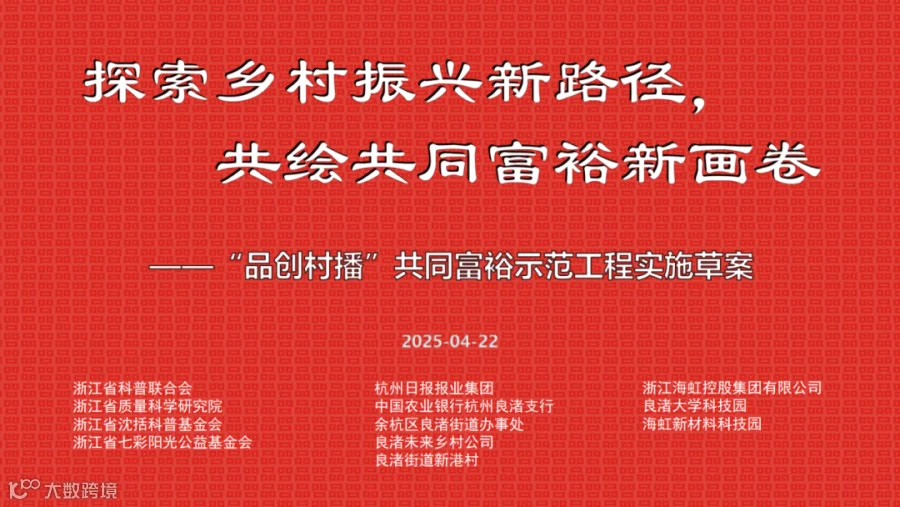 2025年4月22日,由红旅品创、品创科普公益专项基金发起人祝以芳女士提议,在属地政府的指导下,携手品创合作及协作单位代表,怀揣着对共同富裕先行先试的热情,在海虹新材料科技园会议厅开展了“探索乡村振兴新路径,共绘共同富裕新画卷—‘品创村播’共同富裕示范工程实施草案”的讨论会。