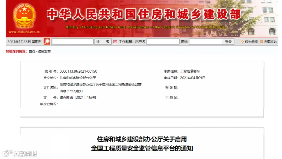 导读:2021年4月9日,住房和城乡建设部发文启用全国工程质量安全监管信息平台
