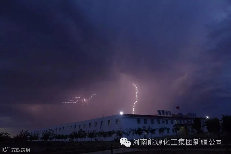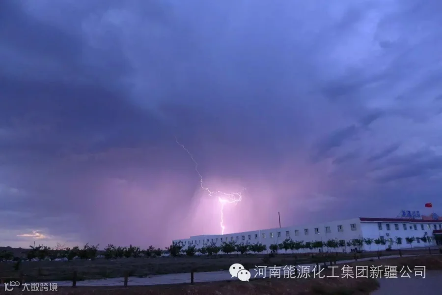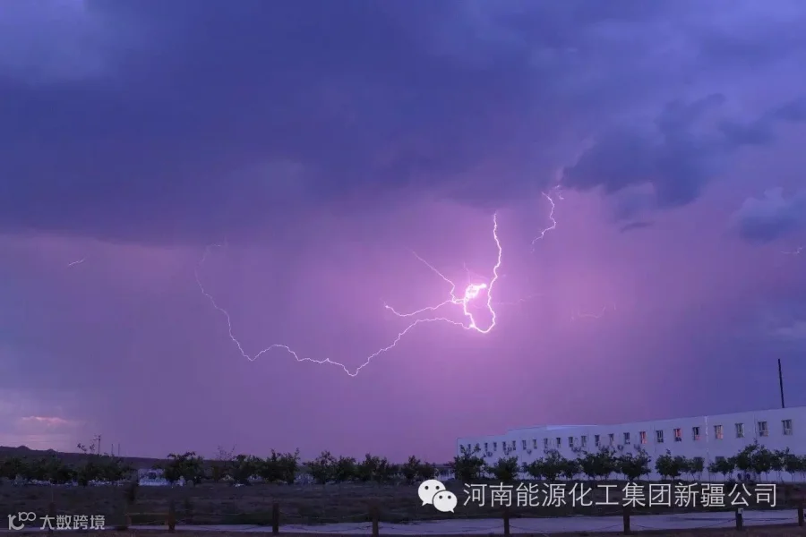 7月11日傍晚,中润煤业职工三三两两的在矿区内散着步,感受着戈壁滩风雨来前的清凉,突然一道闪电刺破密实的云层,像一把光矛直插大地,刺眼的白光渲染得整个夜幕更加深蓝,那悬浮在空中的云便如流沙般倾泻而下,映照着矿区的天空,紫色苍穹展示着神话般的美景。
