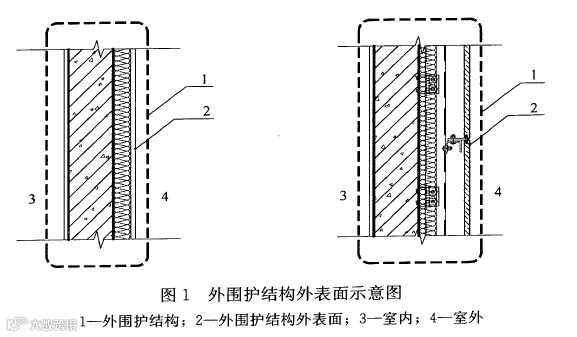 “外表面”是指外围护结构的设计完成面,建筑外围护结构一般由墙体、保温层、饰面层组成,设计完成面即装饰面层外边线;当幕墙作为外围护结构时,“外表面”为幕墙面板外边线(见图1)。